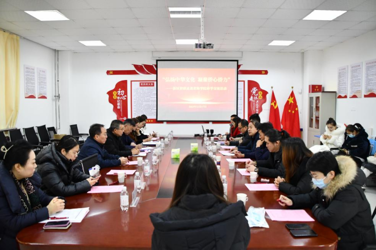 双方首先在马克思主义学院208会议室进行座谈交流。副校长梁忠环首先向刘玉华一行的到来表示欢迎,并向青岛西海岸新区侨联一直以来对学校工作的关心和支持表示衷心的感谢。随后梁忠环介绍了学校27年来的发展建设和办学情况并一同观看了学校宣传片。