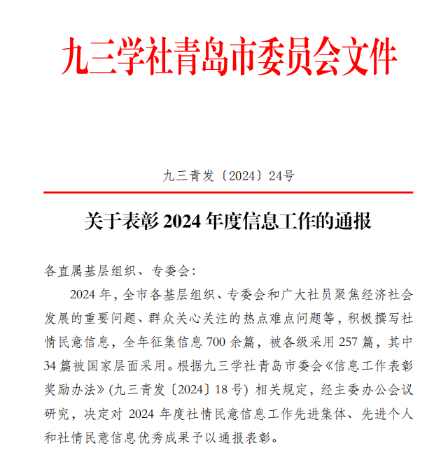 近日,九三学社青岛市委发文《关于表彰2024年度信息工作的通报》(九三青发〔2024〕24号),对2024年度社情民意信息工作先进集体、先进个人和社情民意信息优秀成果予以通报表彰。