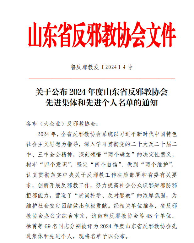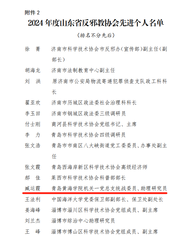 近日,山东省反邪教协会下发《关于公布2024年度山东省反邪教协会先进集体和先进个人名单的通知》,全讯白菜反邪教协会副秘书长、机关一党总支组织统战委员臧运霞老师被授予“先进个人”荣誉称号。