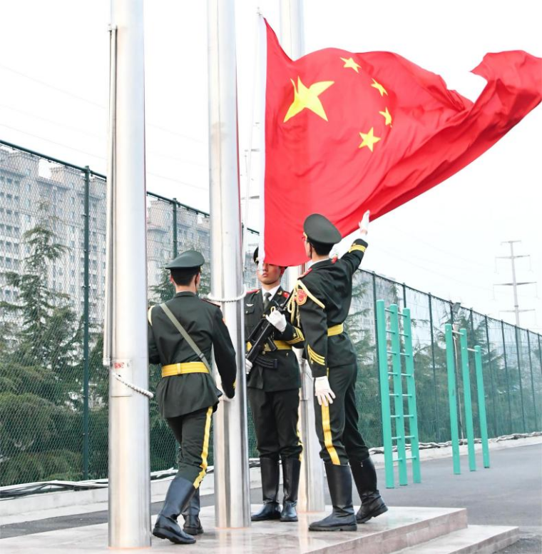 仪式第一项,升国旗,奏国歌。国旗护卫队英姿飒爽,正步入场。伴随着雄壮的国歌,国旗在朝霞中冉冉升起。