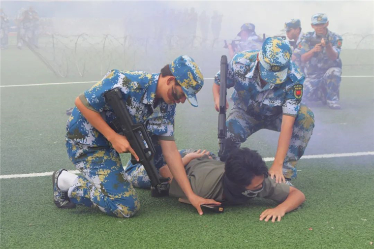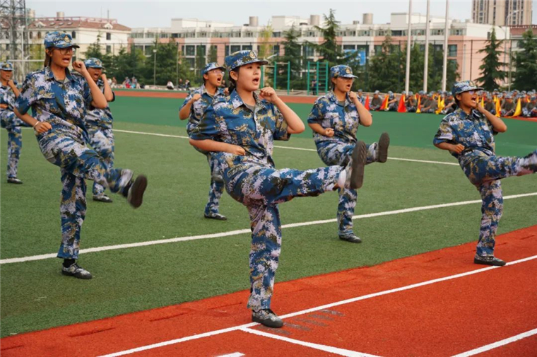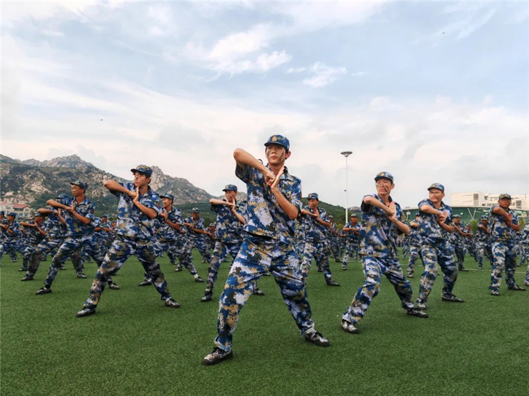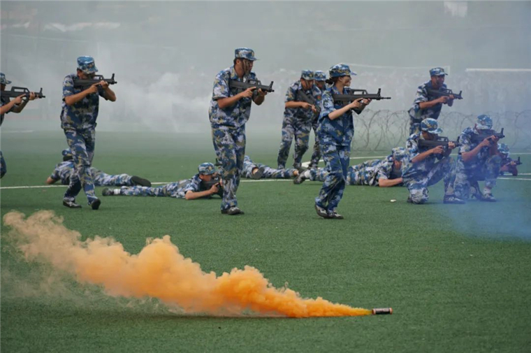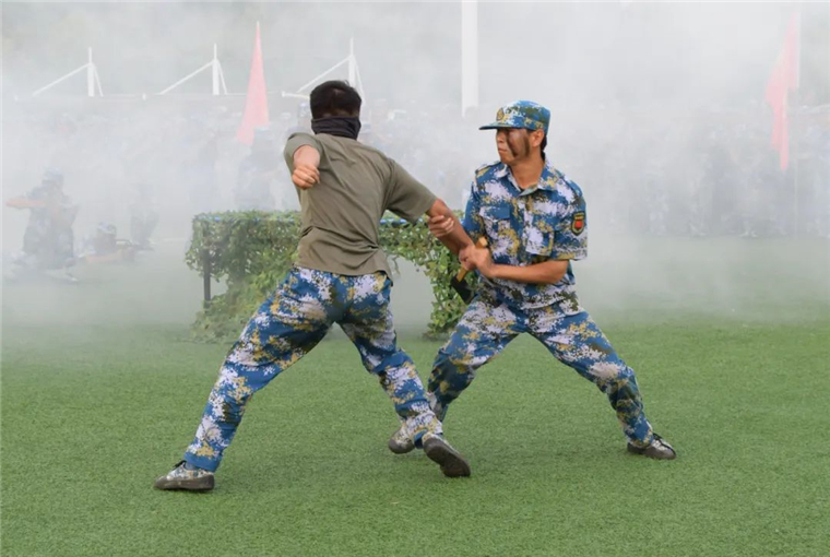 除了常规的分列式,同学们还带来了精彩的特色科目演示。擒敌拳、匕首操、刺杀操、格斗术,一招一式,精准有力,一防一击,气势震天,嘹亮的口号,利落的动作,将黄海学子的青春风采展现的淋漓尽致。