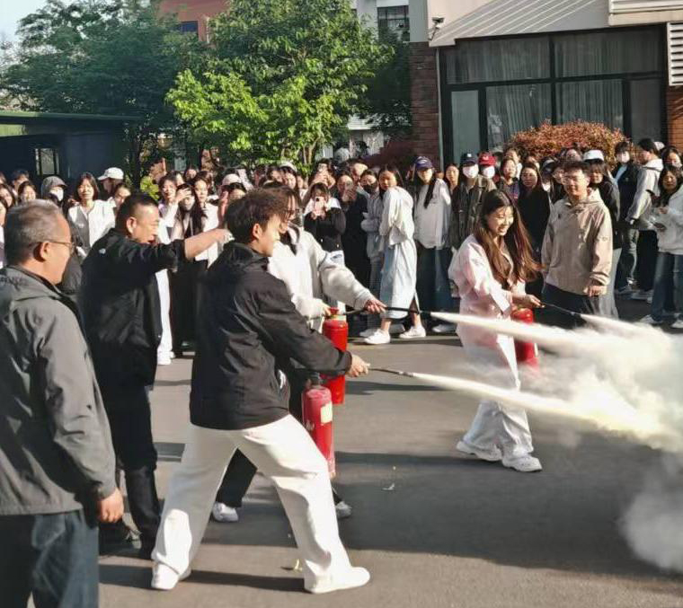 疏散演练结束后,安全管理处工作人员详细讲解火灾预防、逃生技巧及灭火器使用方法,重点演示了“提、拔、握、压”灭火器四步操作法和“甩带、连接、抱握”标准化动作,并设置了油盆灭火场景,组织师生分批次参与灭火器灭火和消防水带灭火实操。
