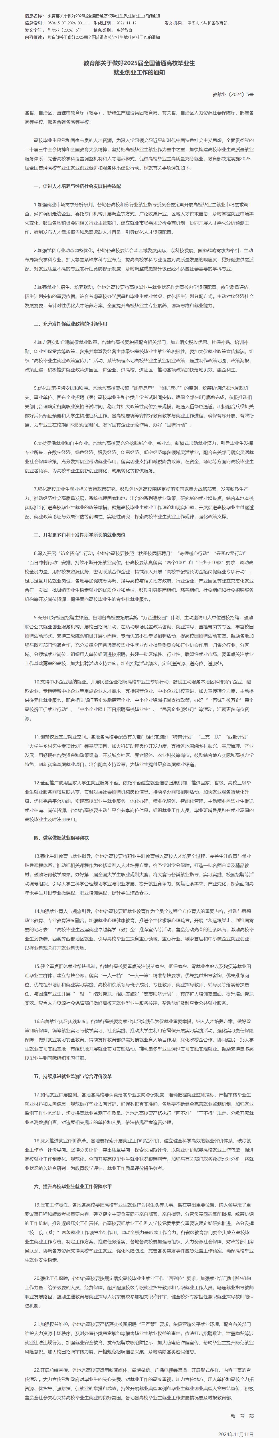 教育部关于做好2025届全国普通高校毕业生就业创业工作的通知