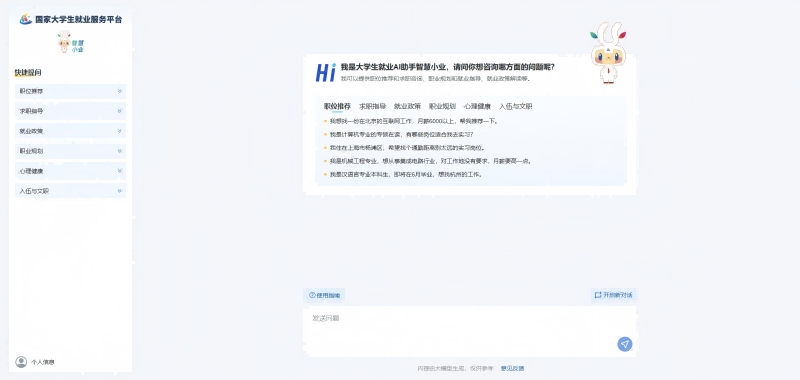 “智慧小业”形象来自于全国大学生职业规划大赛吉祥物“小业”,是一只活力四射的兔子小精灵,寓意即将步入社会的大学生们能在未来“创出一番事业”。“智慧小业”作为创新型AI助手,依托国产大模型技术,全面接入国家大学生就业服务平台,为高校毕业生带来更加智能、高效、精准、安全的就业服务体验,全方位助力高校毕业生就业。