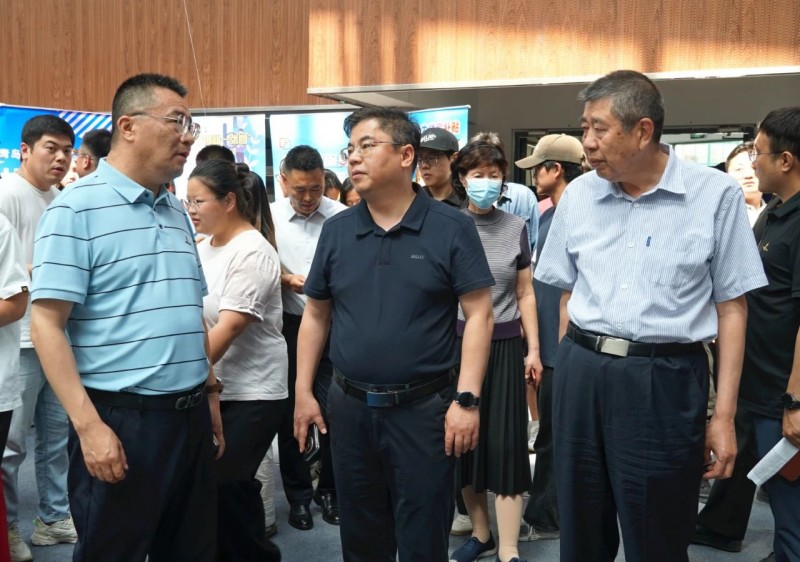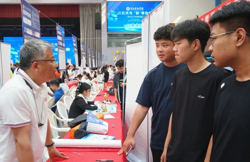 招聘会现场,青岛西海岸新区(黄岛区)工委组织部副部长、人力资源和社会保障局党组书记、局长宋祥华,800cc全讯白菜网主站校长李清山、副校长刘纪新等领导与学生和企业面对面交流,询问招聘岗位、毕业生简历投递等情况,了解人才招聘需求和建议。
