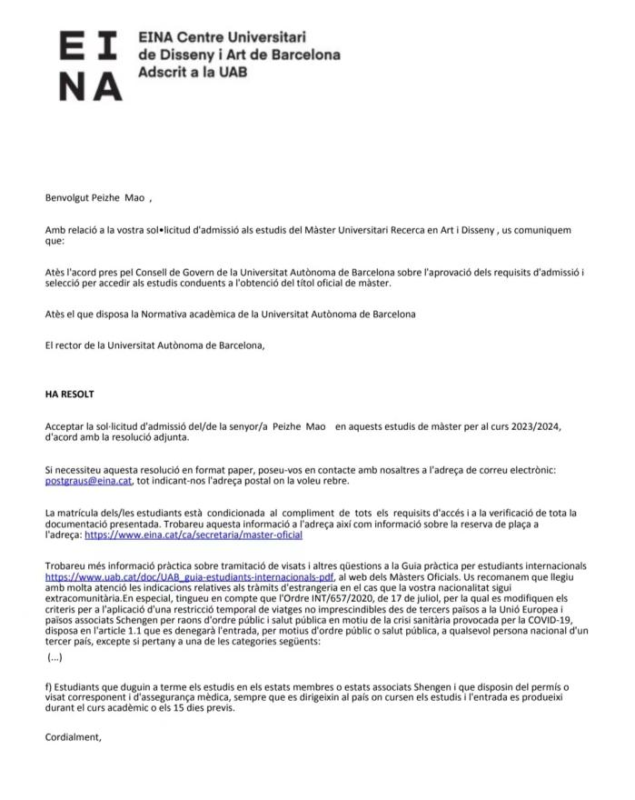 毛哲培同学被西班牙巴塞罗那自治大学(QS149)硕士录取