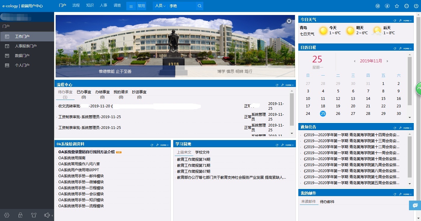 OA系统是黄海学院信息化建设的重要项目之一。系统通过建立学校内部通讯平台、信息发布平台和知识管理平台,实现了工作流程的自动化和分布式办公,不仅提高了办公效率,节省了办公费用,而且增强了领导的决策能力,提高了学校的综合竞争力。