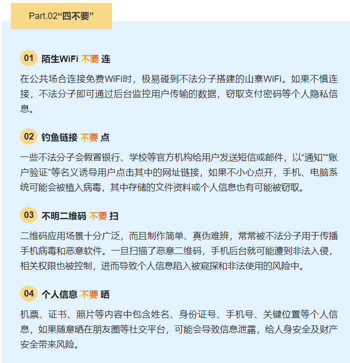 随着互联网科技发展的日新月异,网络在推动社会经济发展、为人民生活带来便利的同时,也引发了信息泄露、隐私侵犯、电信诈骗等诸多社会问题,给广大人民群众的人身和财产安全埋下了隐患。“保密观”总结了日常生活中守护网络安全的“四要”“四不要”,帮您防范化解风险隐患。