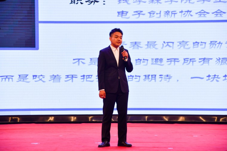 钱学森学院学生会主席李松涛以《凝聚青春力量,扬起使命之帆》为题,分享了自己在学生会和社团中的成长历程。他回忆了参与“挑战杯”比赛时面对复杂项目时的震撼与成长,深刻体会到“电子创新协会”背后的团队协作与传承。担任学生会主席期间,他带领团队创建项目孵化团队,开展50余次跨专业培训,并发起“青春编码行”公益授课活动,将技术创新与社会服务相结合。李松涛动情地说:“我们站在巨人的肩膀上才有如今的收获,更应努力成为别人的肩膀。”学生工作部副部长、校团委书记甄程为他颁发青春宣讲人纪念奖杯。