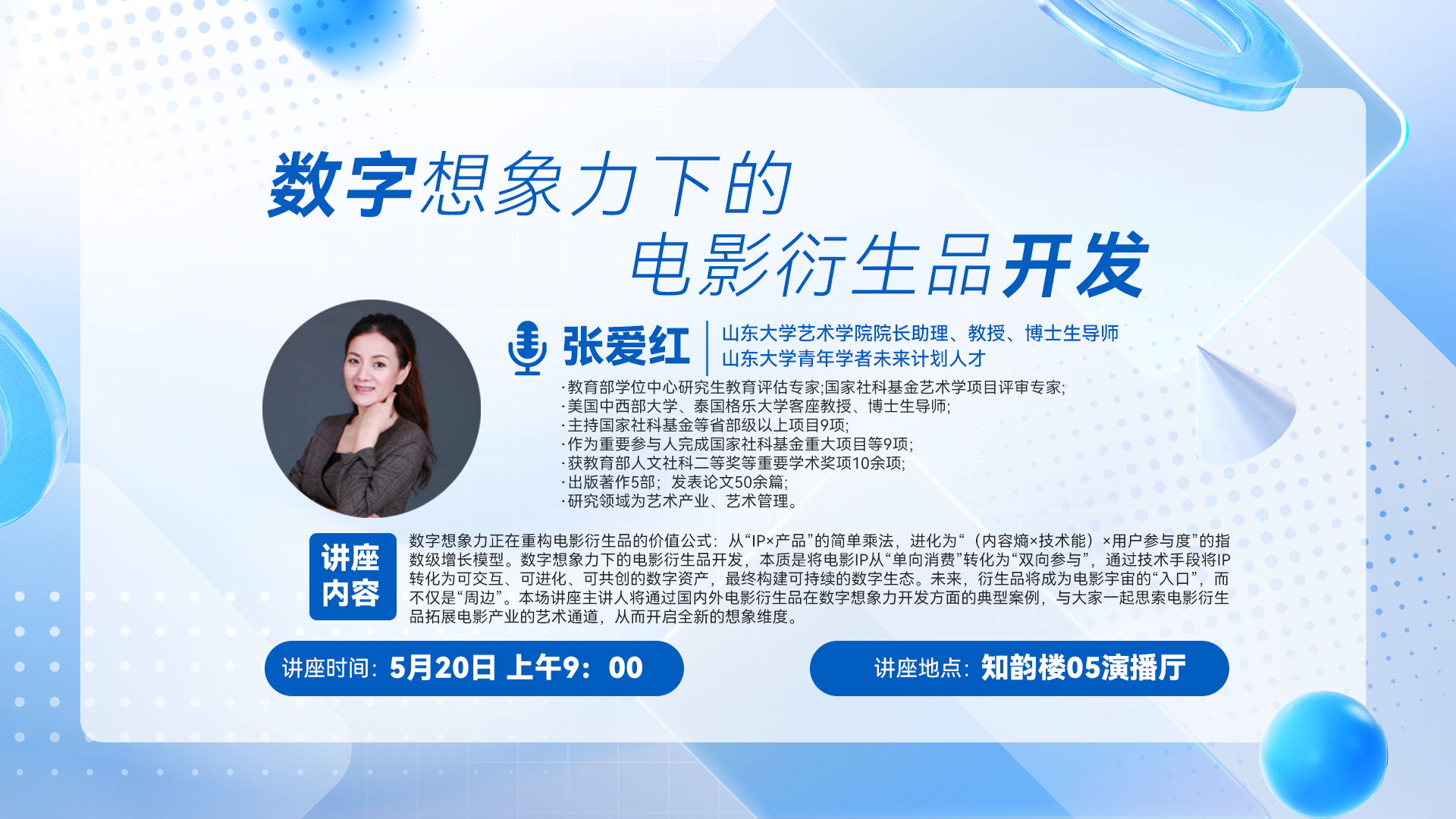 个人简介:张爱红,山东大学艺术学院院长助理、教授、博士生导师,山东大学青年学者未来计划人才;教育部学位中心研究生教育评估专家,国家社科基金艺术学项目评审专家,美国中西部大学、泰国格乐大学客座教授、博士生导师。近年来主持国家社科基金等省部级以上项目9项,作为重要参与人完成国家社科基金重大项目等9项;获教育部人文社科二等奖等重要学术奖项10余项。出版著作5部;发表论文50余篇(英文2篇,CSSCI论文30余篇),14篇被人大复印资料转载,1篇被《新华文摘》全文转载。研究领域为艺术产业、艺术管理。