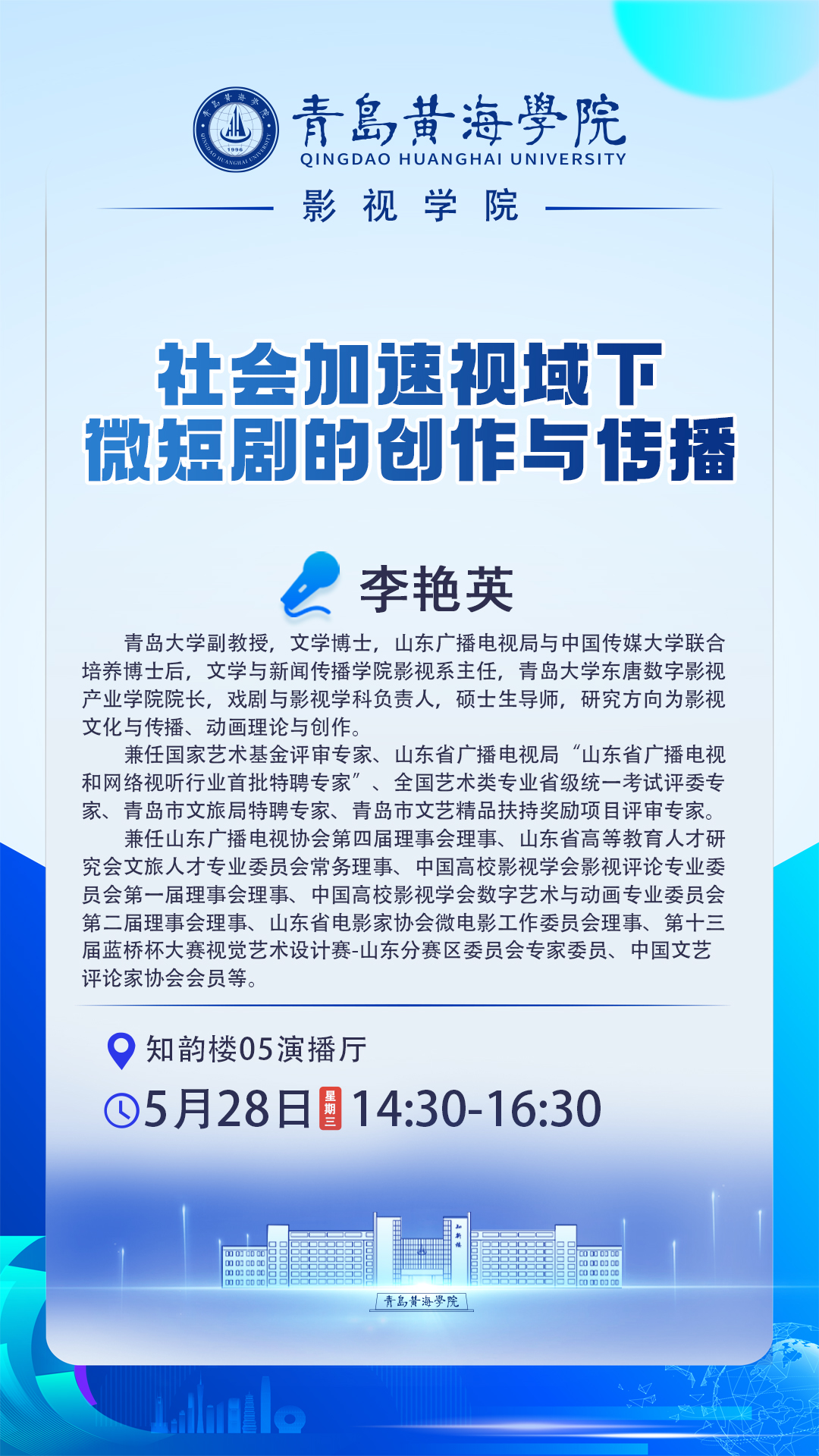 专家简介:李艳英,青岛大学副教授,文学博士,山东广播电视局与中国传媒大学联合培养博士后,文学与新闻传播学院影视系主任,青岛大学东唐数字影视产业学院院长,戏剧与影视学科负责人,硕士生导师,研究方向为影视文化与传播、动画理论与创作。兼任国家艺术基金评审专家、山东省广播电视局“山东省广播电视和网络视听行业首批特聘专家”、全国艺术类专业省级统一考试评委专家、青岛市文旅局特聘专家、青岛市文艺精品扶持奖励项目评审专家。兼任山东广播电视协会第四届理事会理事、山东省高等教育人才研究会文旅人才专业委员会常务理事、中国高校影视学会影视评论专业委员会第一届理事会理事、中国高校影视学会数字艺术与动画专业委员会第二届理事会理事、山东省电影家协会微电影工作委员会理事、第十三届蓝桥杯大赛视觉艺术设计赛-山东分赛区委员会专家委员、中国文艺评论家协会会员等。