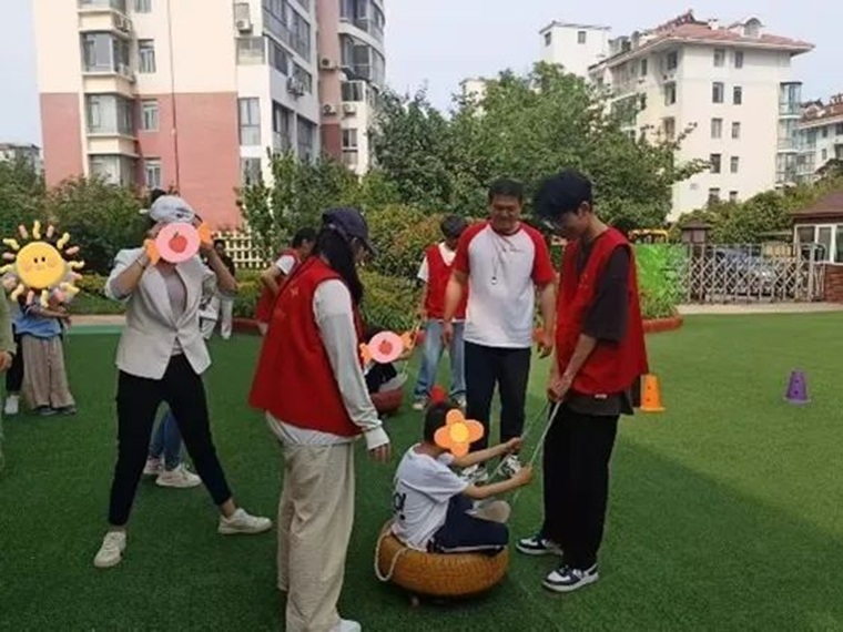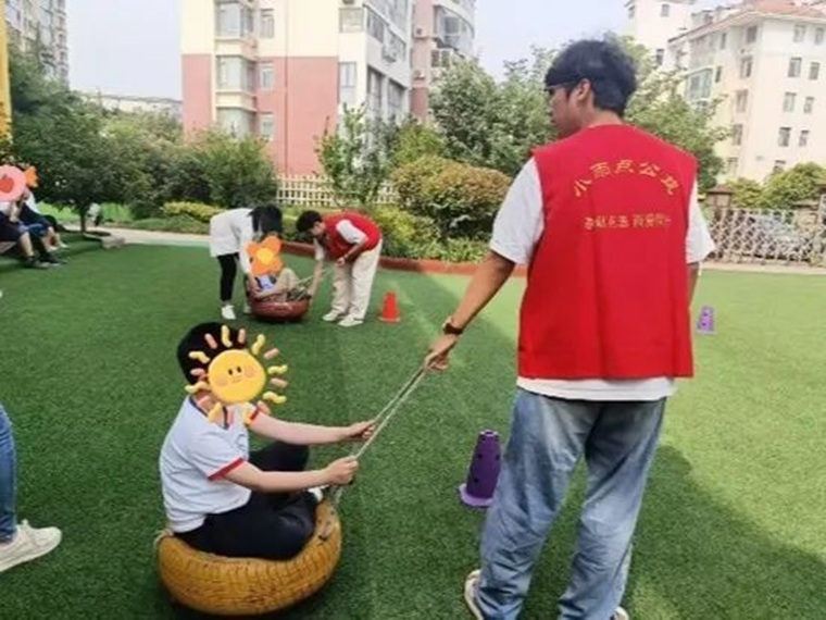 孩子们坐入游戏轮胎,志愿者紧拉绑带带其冲向比赛的终点。轮胎滚动的声响与童真的笑声交织,沿途设置的三角筒和彩带成为“童梦路标”,让活动的激情与节日的喜悦随移动的风景浸润着每个孩子的心灵。