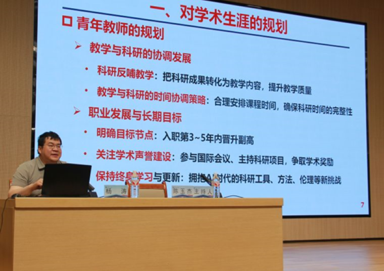 报告中,杨涛教授结合自身丰富的科研经历,从学术生涯规划、如何做科研、如何写文章、如何做报告、如何平衡科研和生活等五个维度展开分享。他强调,青年教师需明确目标、定位与个人规划,科研选题要兼具创新性与可行性;做科研要与时俱进,避免故步自封,鼓励师生关注学科前沿与实际需求的结合点,并养成终身学习的习惯。针对即将攻读研究生的学生,杨涛老师详尽地从研究选题、论文写作、科研能力提升这几个方面给予了详细的指导建议,现场的老师和学生们获益匪浅。最后,杨教授提出平衡科研和生活策略和建议,强调了时间管理、心理调节、身体健康的重要性。报告结束,部分青年博士教师与杨教授就科研中的难点、热点问题展开互动交流。