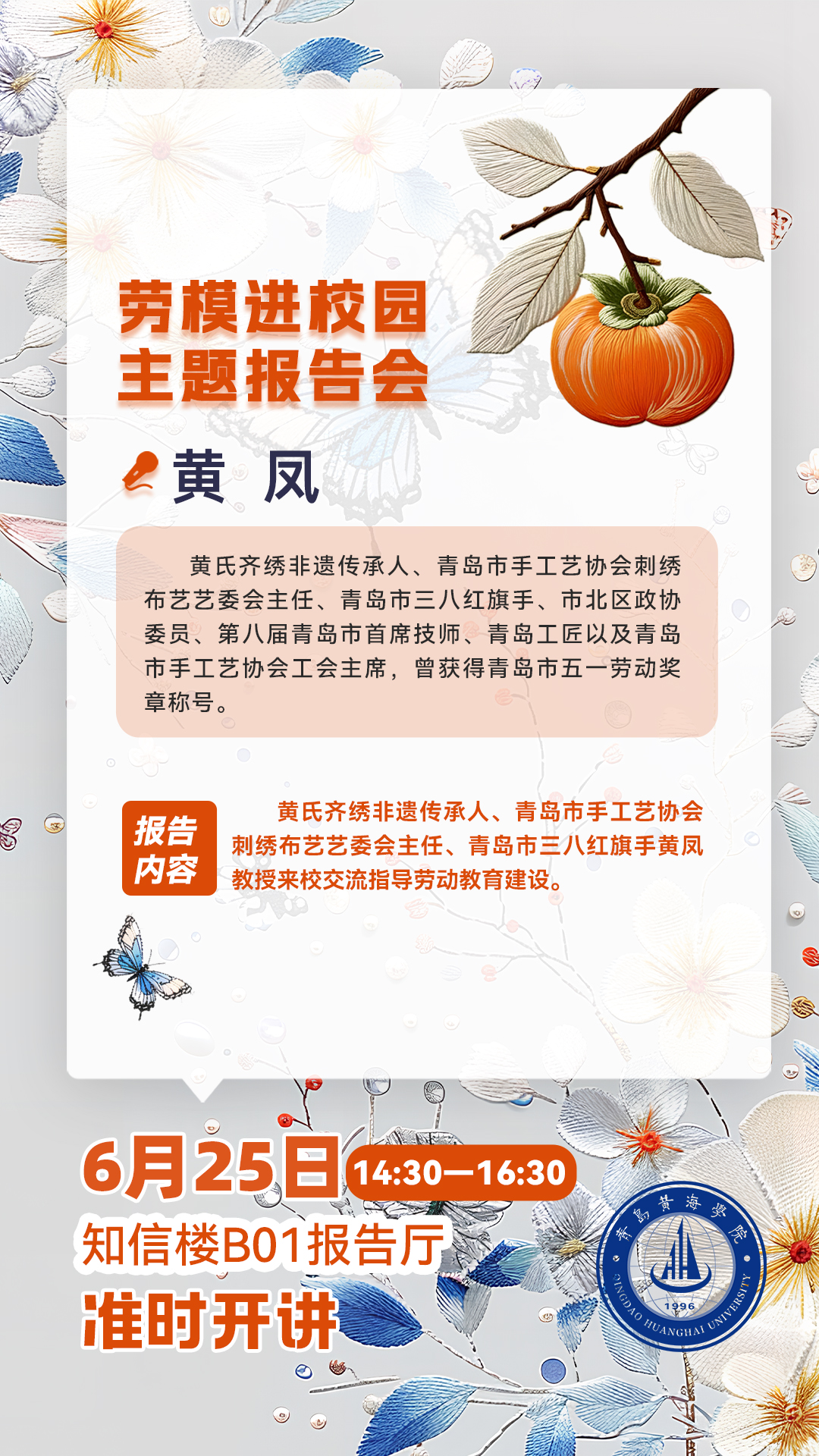 讲座简介:黄氏齐绣非遗传承人、青岛市手工艺协会刺绣布艺艺委会主任、青岛市三八红旗手黄凤教授来校交流指导劳动教育建设。