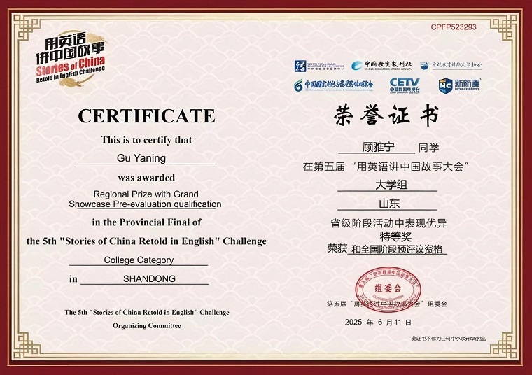 本次比赛旨在通过英语这一国际语言,向世界展示中国深厚的历史文化底蕴、辉煌的发展成就和独特的民族魅力。在山东城市阶段活动中,大学组覆盖30多所高校,共吸引了1.5万余名学生踊跃报名。经过层层选拔,来自全省的43名选手获得了省级决赛角逐资格。决赛现场,选手们围绕中国传统文化、现代发展成就、民族精神等主题,以流利的英语和饱满的热情讲述中国故事。顾雅宁同学在演讲中台风稳健,发音标准,情感真挚,从众多优秀选手中脱颖而出,赢得了评委和观众的一致好评。