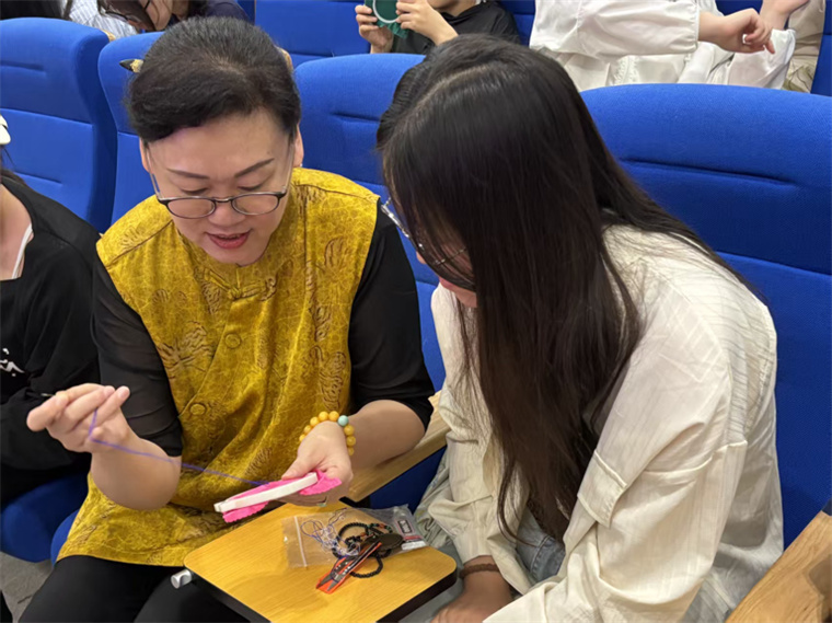 在亲身实操环节,黄凤穿梭于同学之间,针对大家在刺绣时遇到的“线打结”“针法走歪” 等问题,一对一指导纠正。遇到基础薄弱的同学,她更是手把手帮扶,从拿针姿势到落针位置,反复示范,用行动传递着非遗传承的温度。2024级学前教育专科1班邢恩惠同学表示,“原来觉得刺绣很神秘,经黄老师指导,发现只要沉下心就能做好,这和学习、育人是一个道理,得有耐心和专注” 。