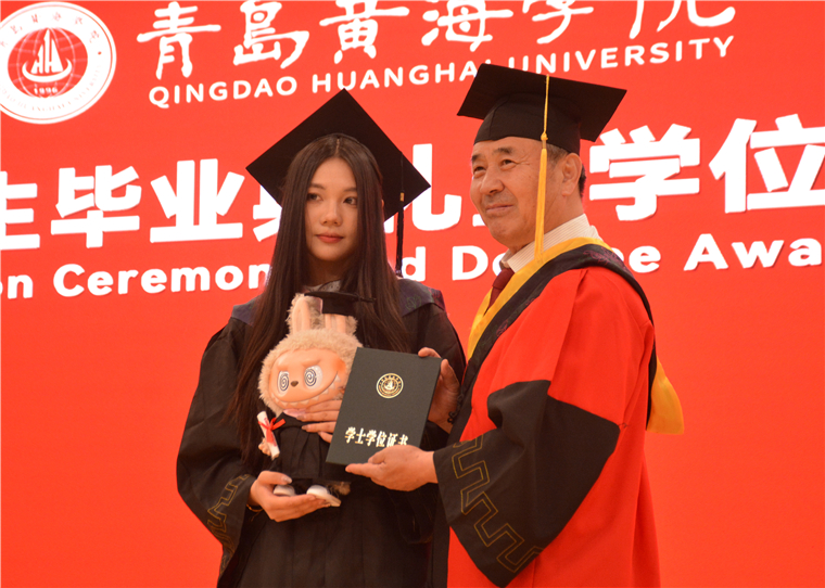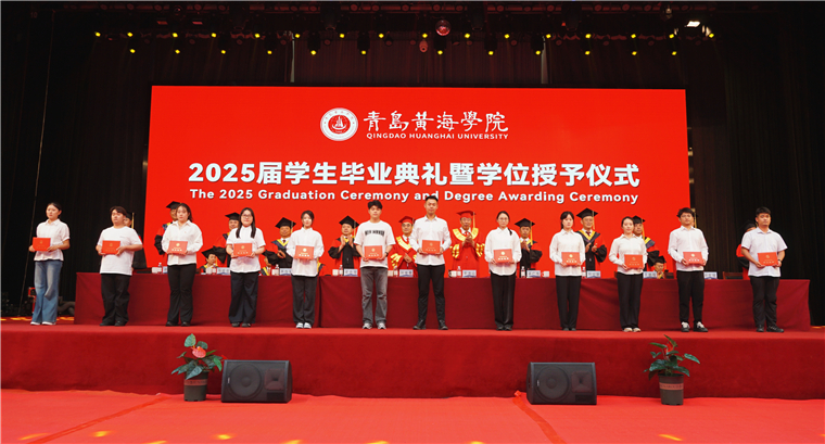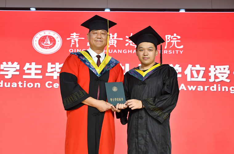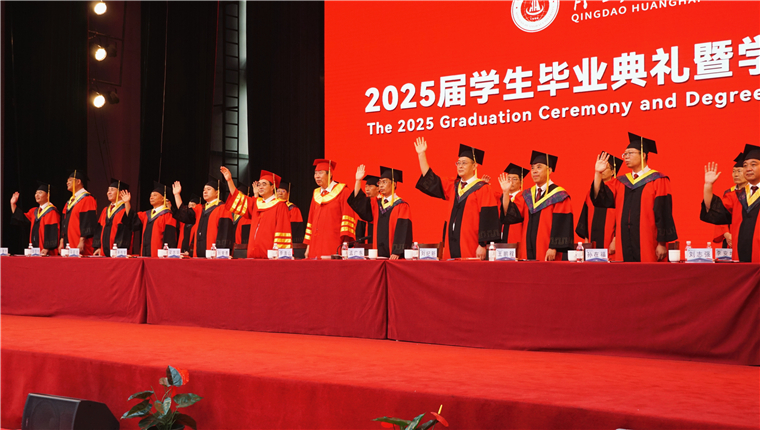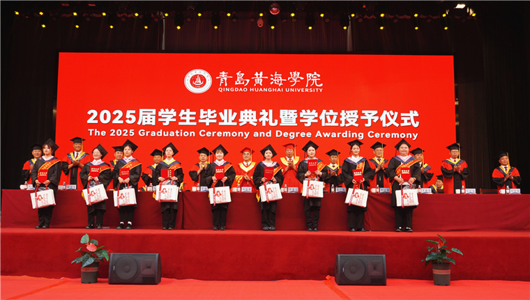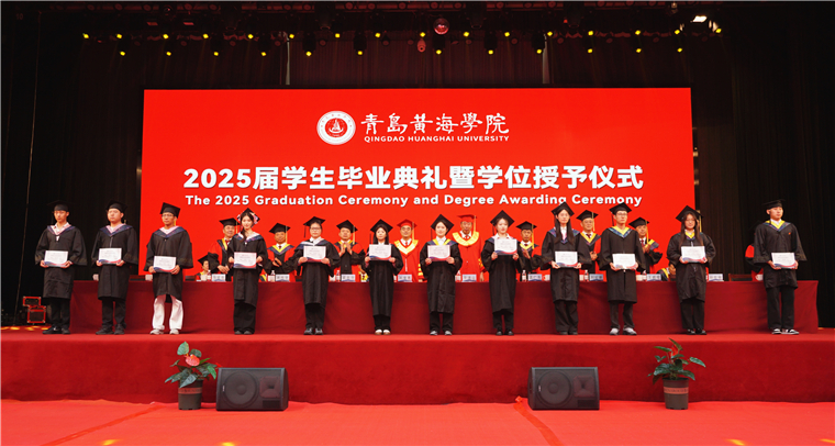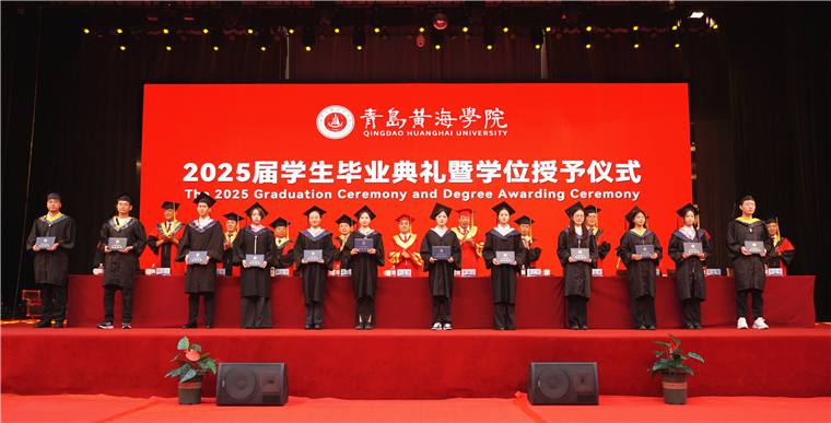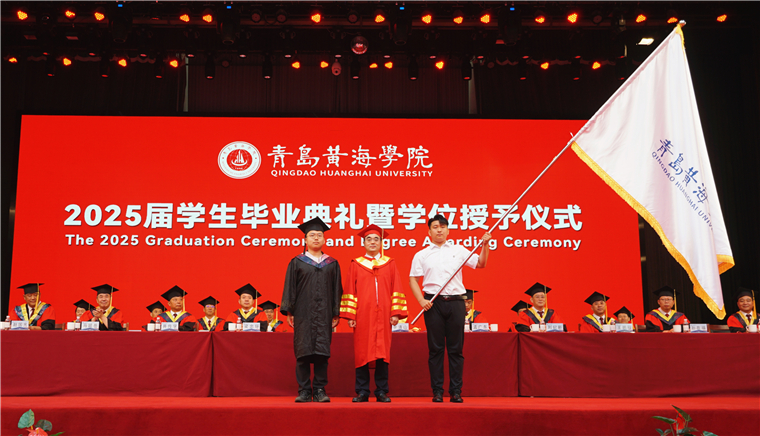 毕业典礼现场举行了神圣的校旗传递仪式。原校学生会主席、智慧城市工程学院2021级工程管理专业薛钧威同学,通过刘常青董事长将校旗传递给现任校学生会主席、智能制造学院2022级船舶与海洋工程专业李增辉同学。这面旗帜,不仅承载着“知行合一”的校训精神,更见证着一代代黄海人拼搏奋斗的光辉历程。校旗的传递,传递的是薪火相传的教育使命,更是历久弥新的育人初心。