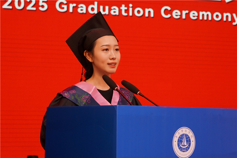 教师代表、智能制造学院孙维丽老师发言。她代表所有教师,为毕业生送上最深的祝福:愿你们在未知的海洋中,始终拥有探索的勇气与导航的智慧;愿你们在纷扰的世界里,永远守护内心的澄澈与热爱的光芒;愿你们在漫长的征途上,永远记得母校曾是你青春启航的港湾。愿毕业生成为以思想为锚、以价值为舵、以大地为根的勇敢探索者,创造属于自己也属于时代的壮阔风景!
