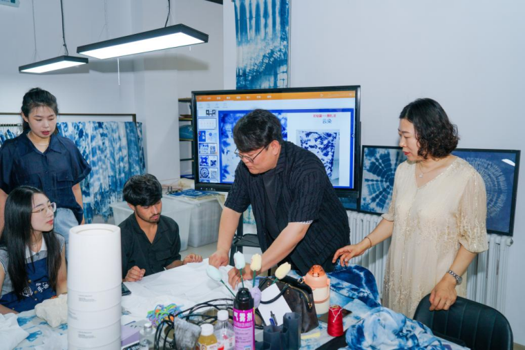 体验环节后,中外师生围绕“非遗的当代价值”展开交流。来自巴基斯坦的山东工艺美术学院留学生KHAN SAJJAD ALI提出:“中国扎染的蓝白纹样曾是江南水乡的诗意注脚,但如今,快时尚让传统手作显得‘慢’而‘旧’。若将扎染的‘冰裂纹’转化为数码印花图案,或用交互设计让用户通过APP模拟扎染过程,是否能让非遗在快节奏中‘慢’下来?”他展示设计概念:扎染纹样与巴基斯坦传统“卡车艺术”几何纹碰撞,生成动态视觉海报。甄晶莹老师表示:“非遗的国际化传播需要‘守正创新’。青岛基地与黄海学院的合作,正是以‘手造’为纽带,推动传统技艺与现代设计、本土文化与世界文明的深度对话。”