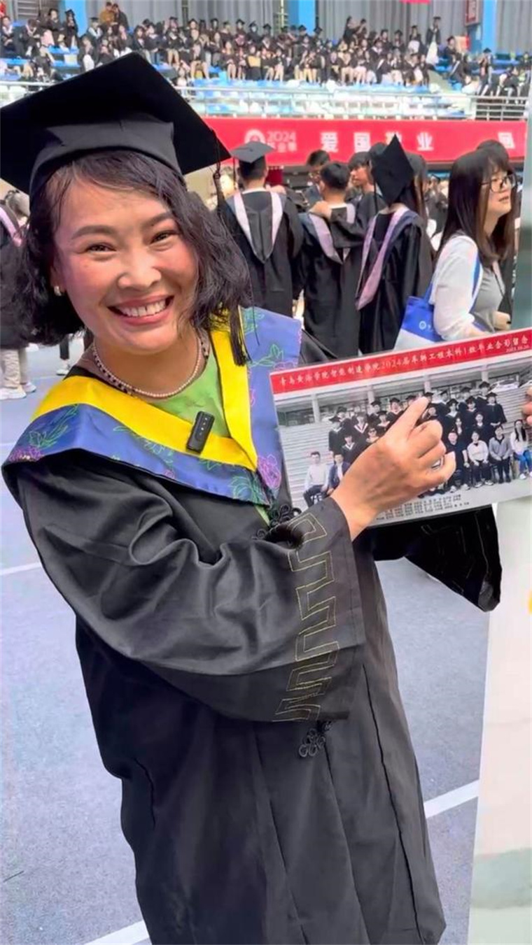 她拿着比自己还高出一大截的易拉宝,缓慢地走到舞台中央。低下头,由校领导将帽子上的穗由一边拨到另一边。“我这才知道原来儿子说的‘拨穗’是这个意思,这一趟我也涨知识了。”