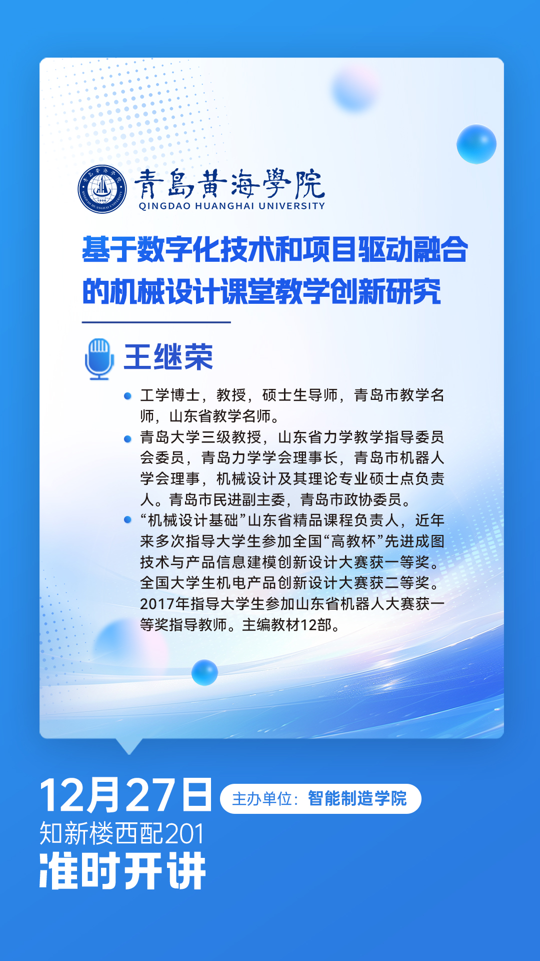 讲座主题:基于数字化技术和项目驱动融合的机械设计课堂教学创新研究