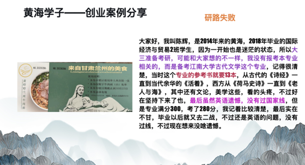 图6是陈辉同学发给我的创业故事,以其创业的亲身经历,与同学们进行了分享。创业故事围绕考研-民宿-外卖-餐饮四个方向为分享重点。以第一人称的视角,分享了创业故事,为同学们的创业提供了宝贵的一手资料。经过课件设计,故事分享,大部分学生能够切身体会到创业之艰辛。
