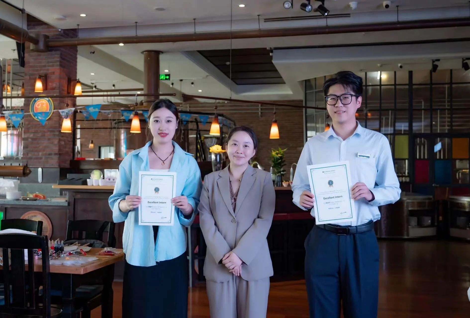 在青岛银沙滩温德姆至尊酒店专业技能实习的裴金特和贾媛月同学实习期间表现优异,得到了酒店领导的肯定,被评为“优秀实习生”,酒店总经理与他们合影留念。