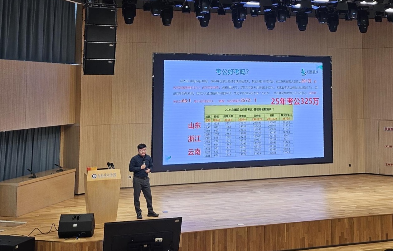 随后,考研规划专家黄老师为同学们带来专业备考指导。黄老师从"目标院校选择""备考时间规划""科目复习策略"三个维度展开讲解,特别强调财务管理专业学生要发挥数理基础优势,重点突破专业课程。针对同学们普遍关心的"如何平衡专业课学习与考研复习"问题,黄老师建议:"要善用课堂学习资源,将日常专业学习与考研复习有机结合。"