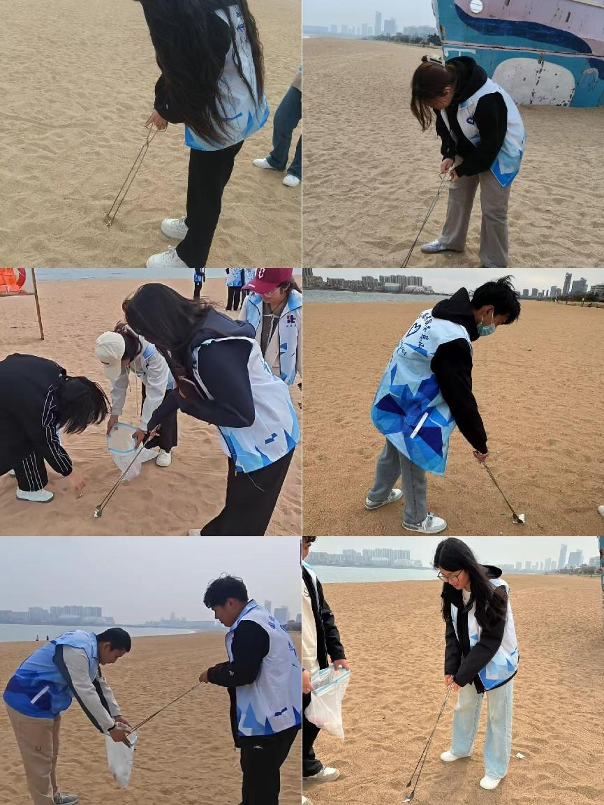国际商学院“小黄锋”志愿者们满怀热忱,身着整齐划一的志愿服装,手持专业夹钳与环保袋,迅速分组,沿着蜿蜒的海岸线有条不紊地展开清理工作。他们以严谨认真的态度,不放过任何一处角落,无论是被海浪冲上岸的塑料瓶、沙滩上的烟头,还是各类难以降解的塑料制品,都被逐一拾起,并仔细分类装入环保袋。在清理过程中,大家齐心协力,遇到大件垃圾时,相互协作共同搬运,发现隐蔽的垃圾,相互提醒仔细寻找,充分展现出不怕苦、不怕累的奉献精神。