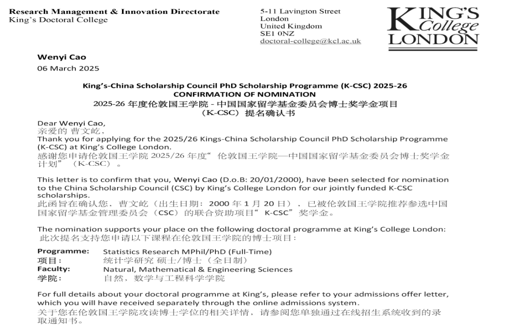 凭借扎实的学术积淀与卓越的科研潜力,曹文屹于2025年成功获得中国国家留学基金委员会(CSC)博士奖学金,即将赴英国伦敦国王学院(King’s College London)攻读统计学博士学位。该项目旨在支持全球顶尖青年学者开展前沿研究,其研究方向聚焦于大数据分析与统计建模的创新应用。这一荣誉不仅是对他过往学术成就的肯定,更标志着其科研生涯迈入国际化新阶段。曹文屹表示,将以此为契机,深化跨学科研究,为统计学领域的发展贡献中国智慧。