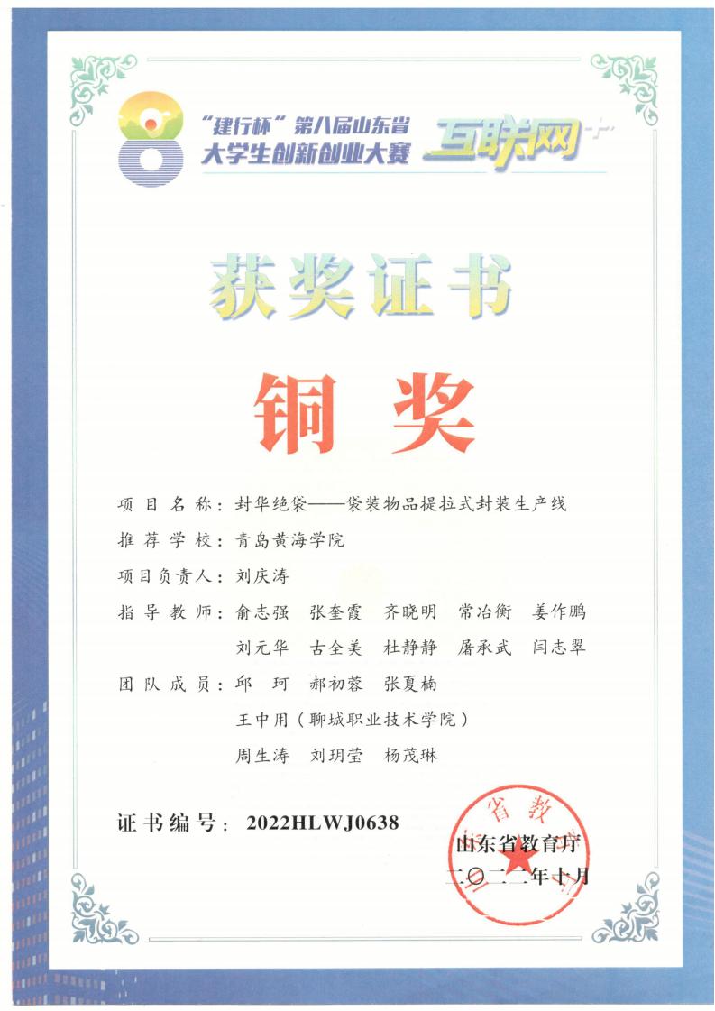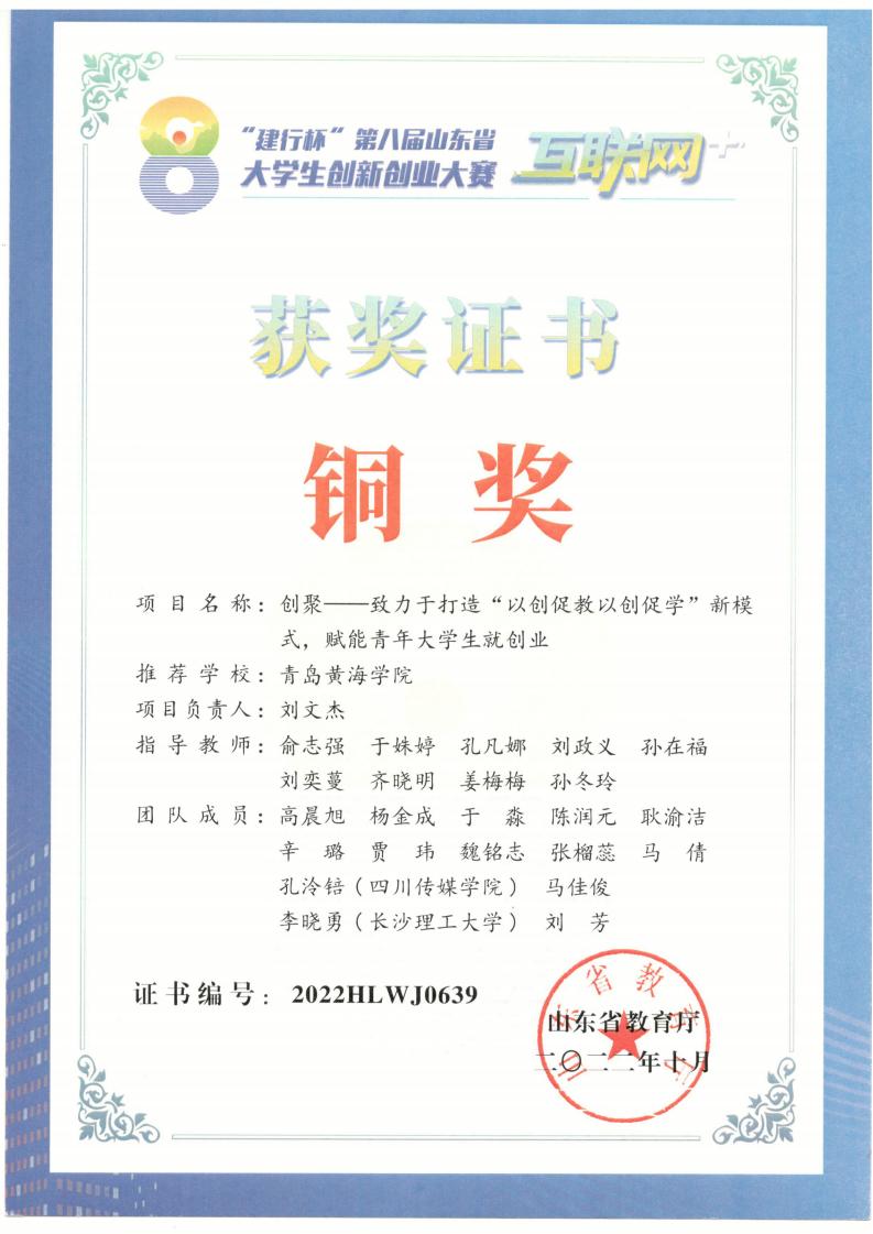 第八届山东省”互联网+“大学生创新创业大赛铜奖