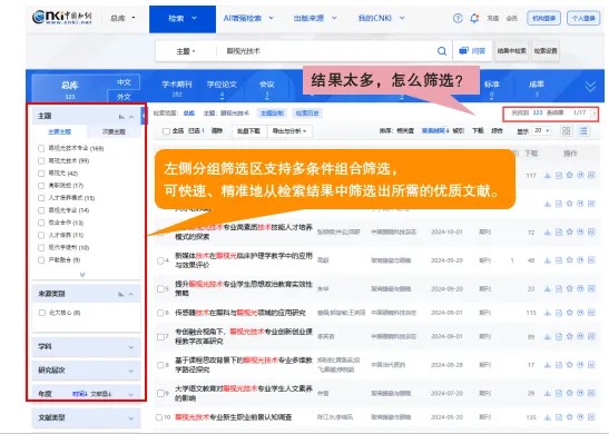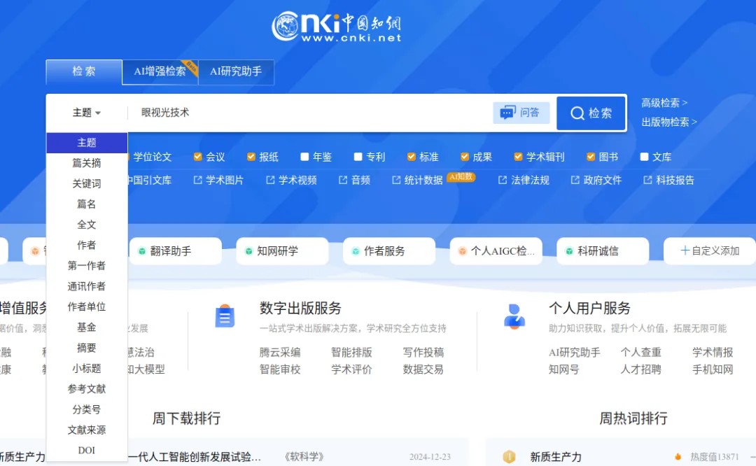 1.文献检索一框式”检索——主题检索:如检索“眼视光技术”相关文献,可将主题词“眼视光技术”限制在主题、摘要、关键词等字段进行检索。