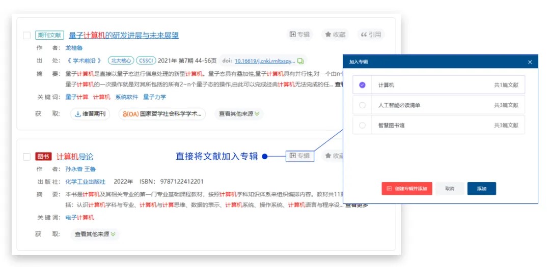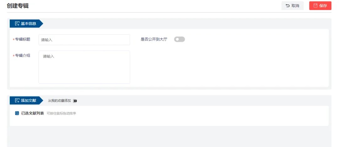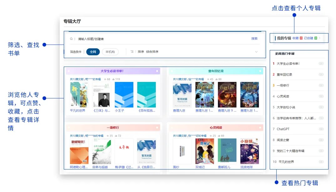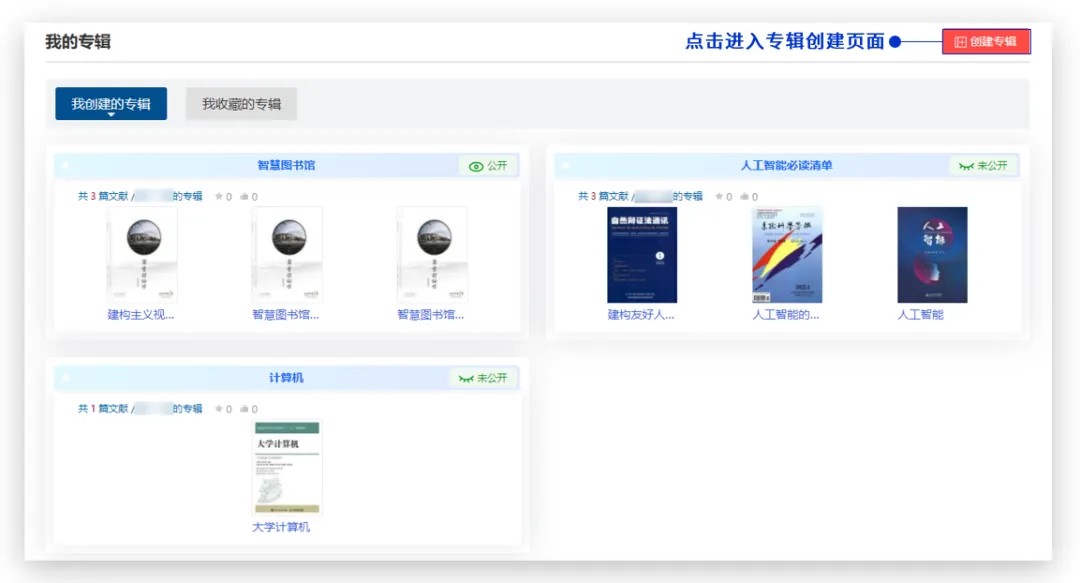 读者可以创建专辑,将高质量文献或常用知识进行集中化管理,提升知识利用效率,也可将专辑设为公开,分享知识。