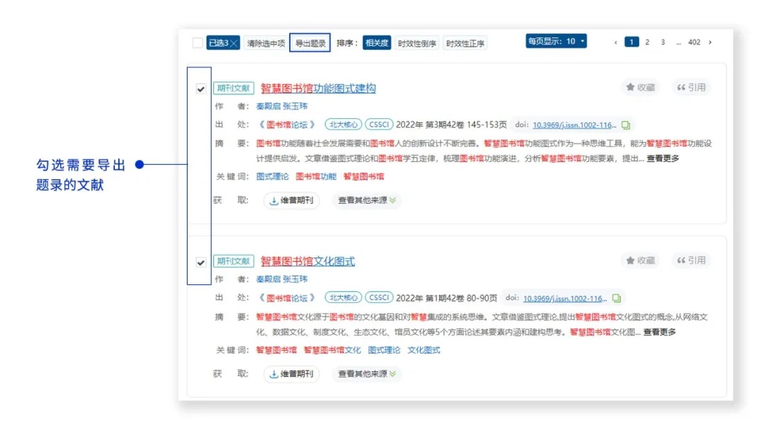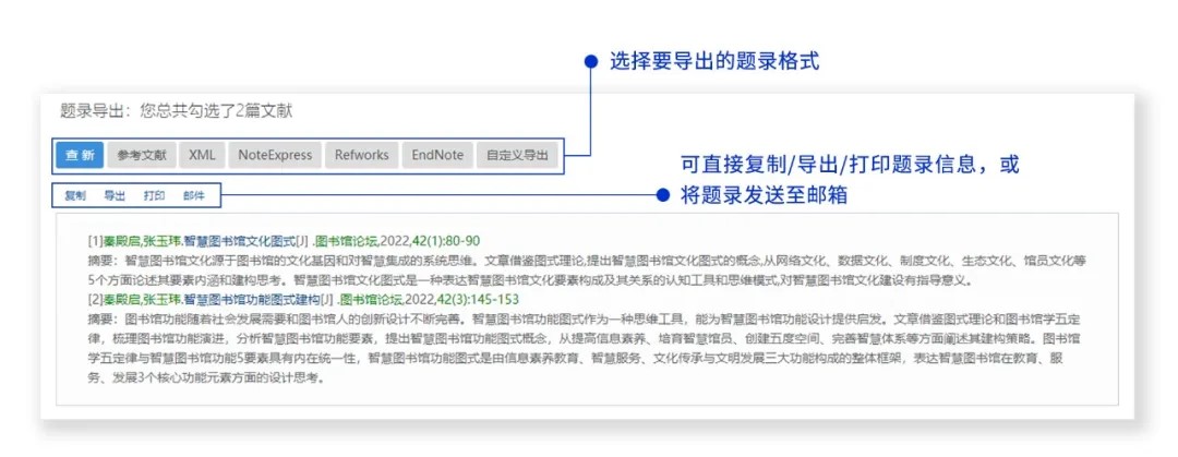 读者可通过经纶快速导出文献的题录信息,以满足论文写作、查新等需求。