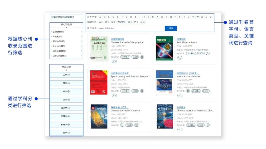 通过期刊的关键词、刊名首字母、语言种类、核心收录、学科分类等筛选和查找期刊。