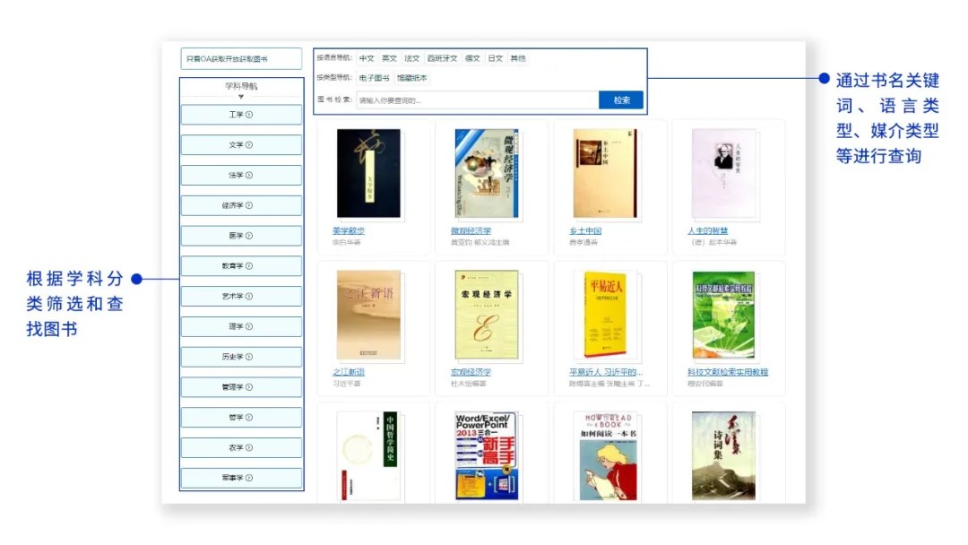 可通过图书关键词、语言类型、媒介类型、学科分类进行筛选。
