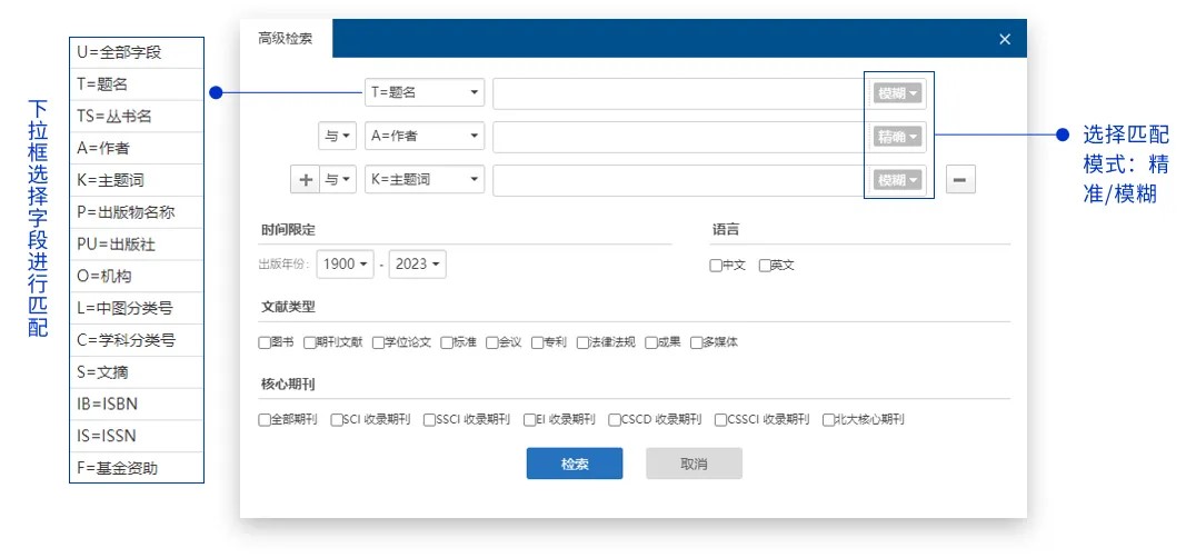 点击检索框右侧的“高级检索”按钮,在弹出的页面中,组合多个条件进行限定性检索。