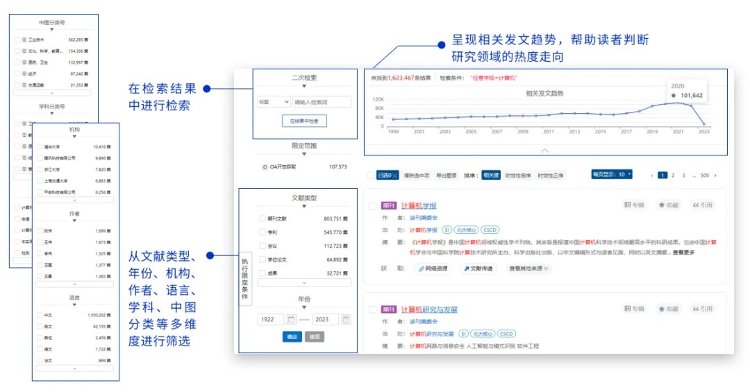 《维普经纶知识服务平台》整合全球中外学术文献,覆盖多种文献类型。通过数据挖掘,知识关联为读者带来独一无二的检索体验。只需使用统一检索框,即可快速检索获取图书馆的各种电子文献数据,全球专业学术文献及免费优质学术资源。提供来自1,000+内容供应商的数亿中外文献记录,其中外文资源超过5亿条。为读者乐享知识探索。
