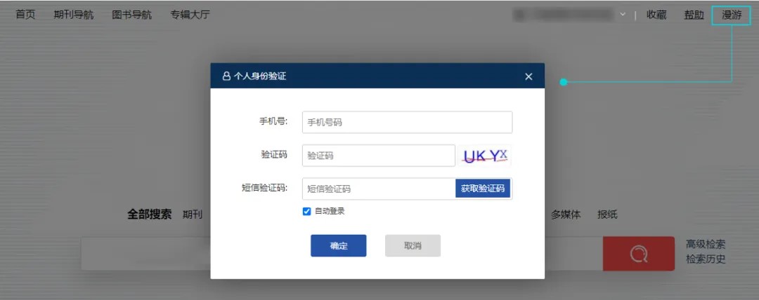 读者需先通过 IP 认证进入系统,点击页面顶部的“漫游”按钮,通过手机号进行个人身份认证。