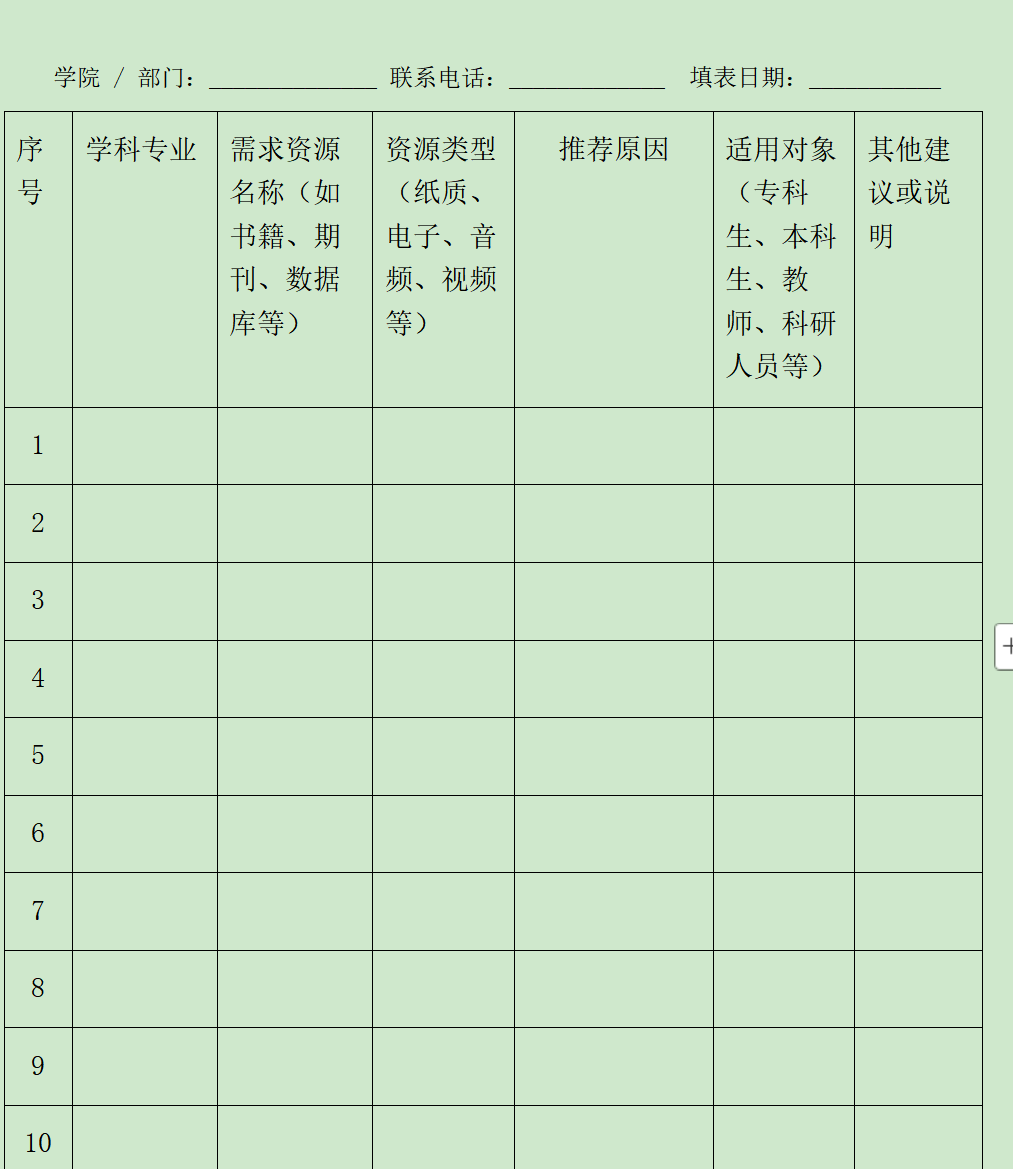 (一)请各学院、部门提前梳理本学科、部门的文献资源需求及对图书馆工作的意见建议。