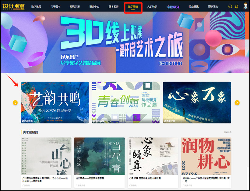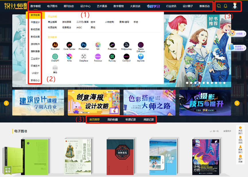 功能板块:上方功能栏,根据功能内容分为【数字教程】【电子图书】【期刊杂志】【设计中心】【艺术素养】【数字展馆】【大家访谈】【专题学习】【行业资讯】【设计圈子】【赛事活动】,共十一大板块,可选择所需功能及资源使用;