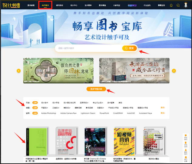 点击最上方一栏的【电子图书】,可在【搜索栏】输入关键词搜索电子书,或点击【更多专题内容】进入专题电子书阅读;或通过行业、技能、软件三大分类筛选电子书。