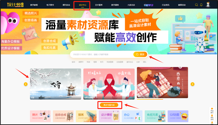 点击【更多专题内容【查看专题素材内容,紧跟季节、节日及热点话题等更新的海量专题素材,可根据设计需求便捷查找并下载使用素材;