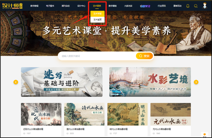 点击最上方一栏的【艺术素养】,可进入【艺术学堂】和【艺术鉴赏】进行学习。