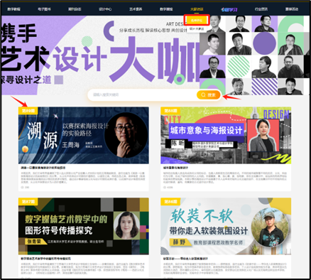 点击【大家访谈】,进入【名师讲坛】可跟随设计领域顶尖名师专题频道进行名师设计理念等课程学习,点击即可观看最新一期艺术设计大咖讲坛;