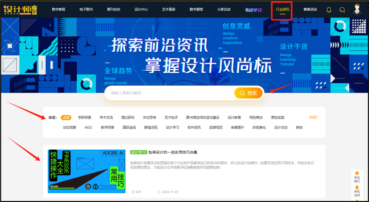 点击最上方一栏的【行业资讯】;搜索栏及标签栏可检索并筛选相关主题资讯,涵盖学研探索、学术交流、理论研究等内容,点击即可进入阅读时下前沿艺术设计领域资讯,洞悉行业动态。
