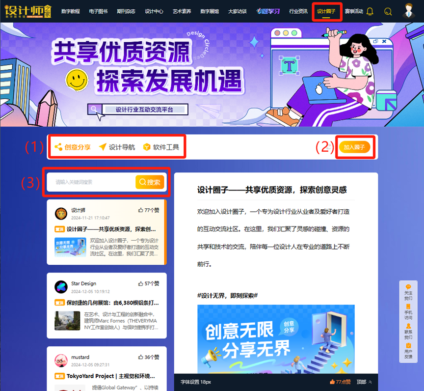 (1)【设计圈子】是专为设计行业从业者及爱好者打造的互动交流社区,集合创意分享、设计导航、软件工具三大板块的优质帖子,支持各设计创意及资源的交流及分享,由各界设计师汇聚创意的设计资源库;