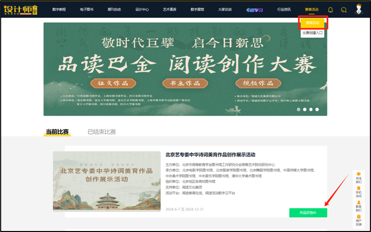 (1)点击最上方一栏的【赛事活动】;可参加各级别创新创意设计大赛,通过活动入口进行报名、作品上传并关注活动动态等;