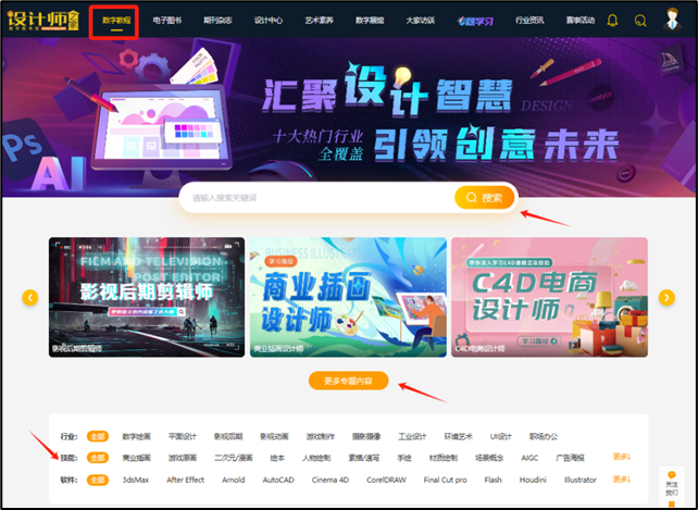 点击最上方一栏的[数字教程],可在[搜索栏]输入关键词搜索课程,或点击[更多专题内容]进入专题学习,行业、技能、软件三大分类快速找到适合自己的课程视频资源进行学习;