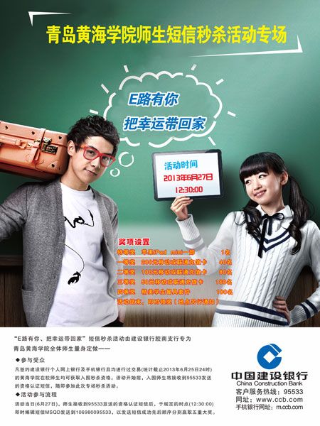 “E路有你、把幸运带回家”短信秒杀活动由建设银行胶南支行专为800cc全讯白菜网主站全体师生量身定做——